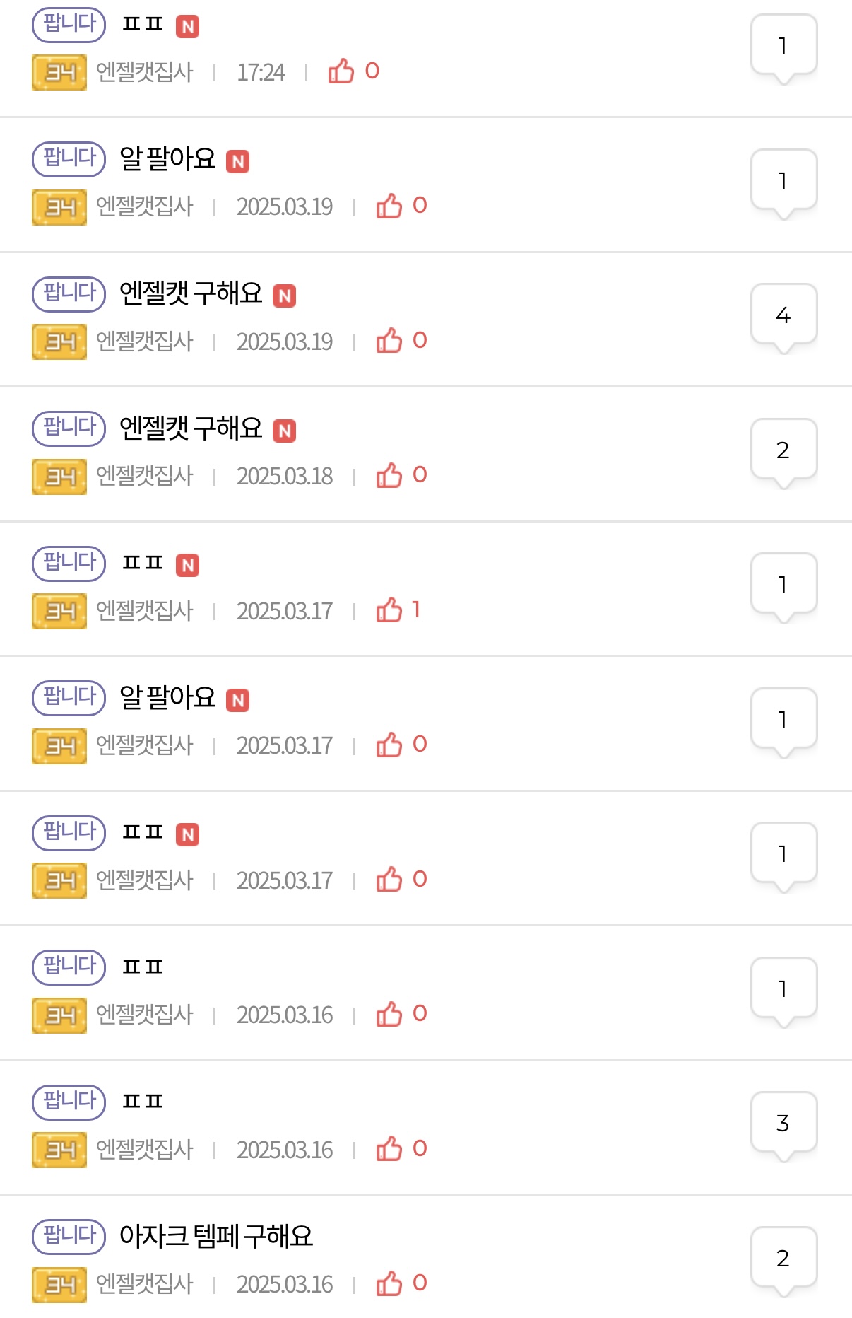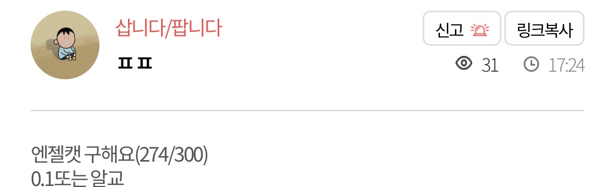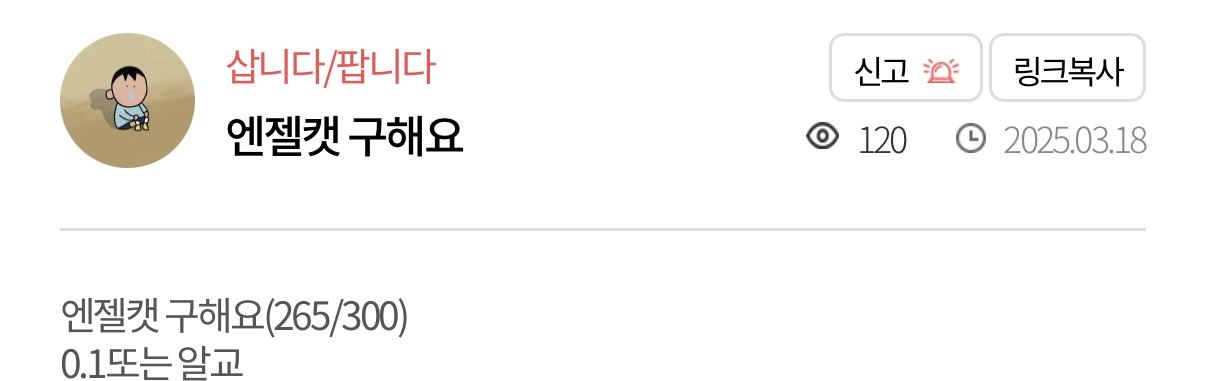 모을거면 곱게 조용히 사든가 ‘몇달’ 동안 매일 구매글 ‘몇개’씩 써가면서 쓸때마다 아무도 안궁금한 엔젤캣 수집 현황 알려줌.