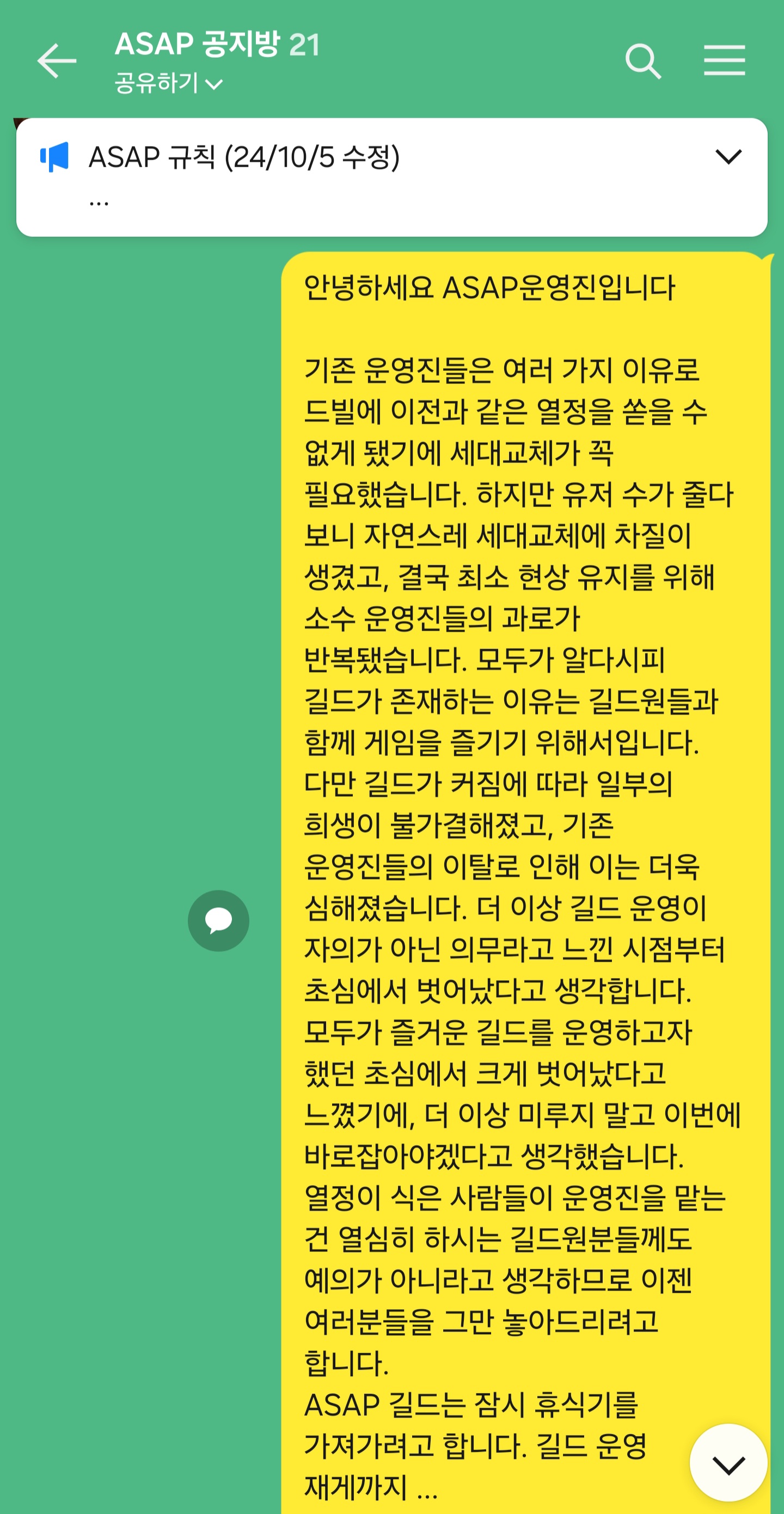 그리고 해체당시, 길드의 휴식을 알리며 길드원분들의 이적을 자유롭게 해드렸습니다.