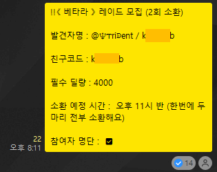모집 - 친구추가 - 소환 - 레이드 진행 - 딜량 및 비매너 인원 체크 - 해산(친구삭제 자율)