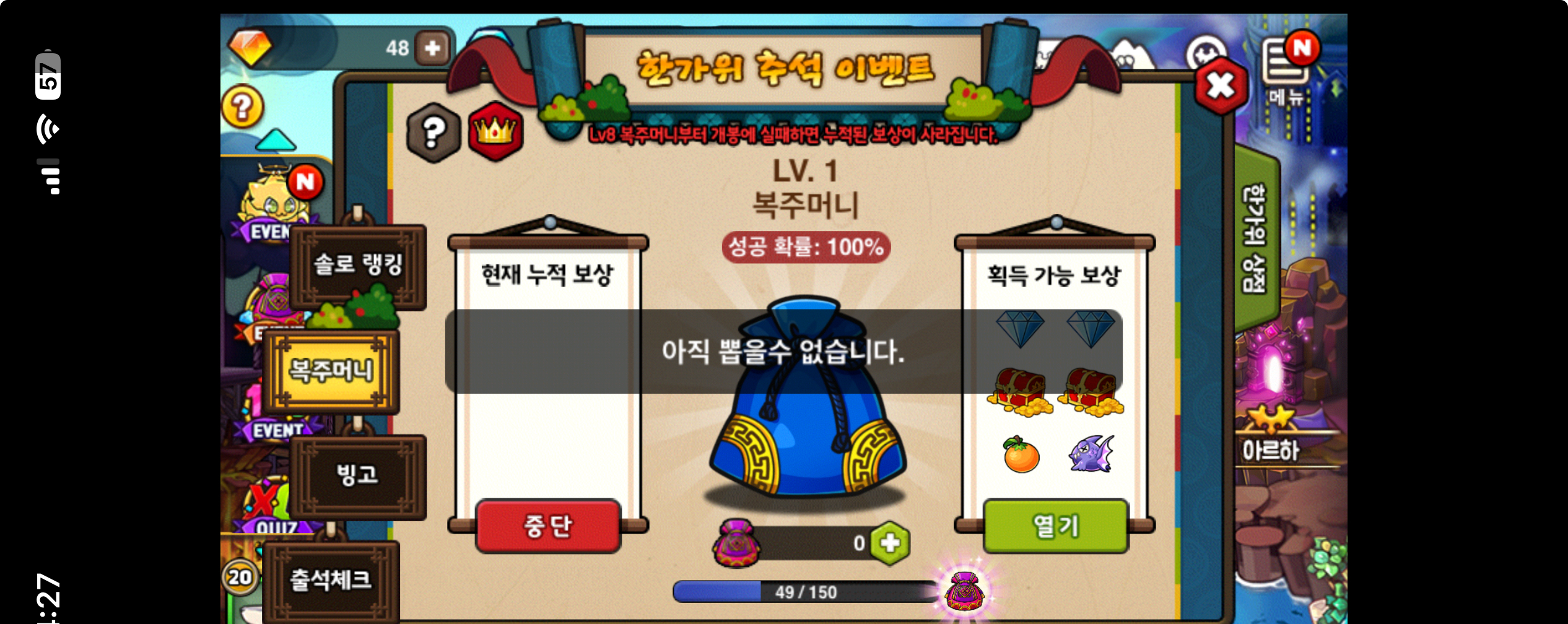 복주머니 천장 채웠더니 아직 뽑을 수 없다고 뜨네요..
