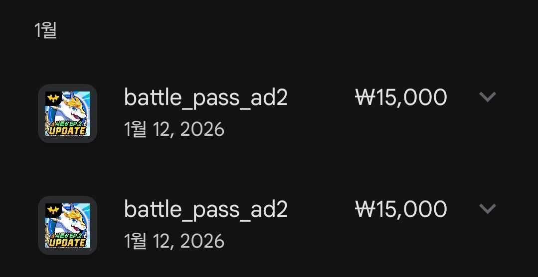 5. 총 3000원 오류결재 및, 12000원의 고급 초월 패스 결재 무효, 15000원 고급 강림 패스의 중복결재