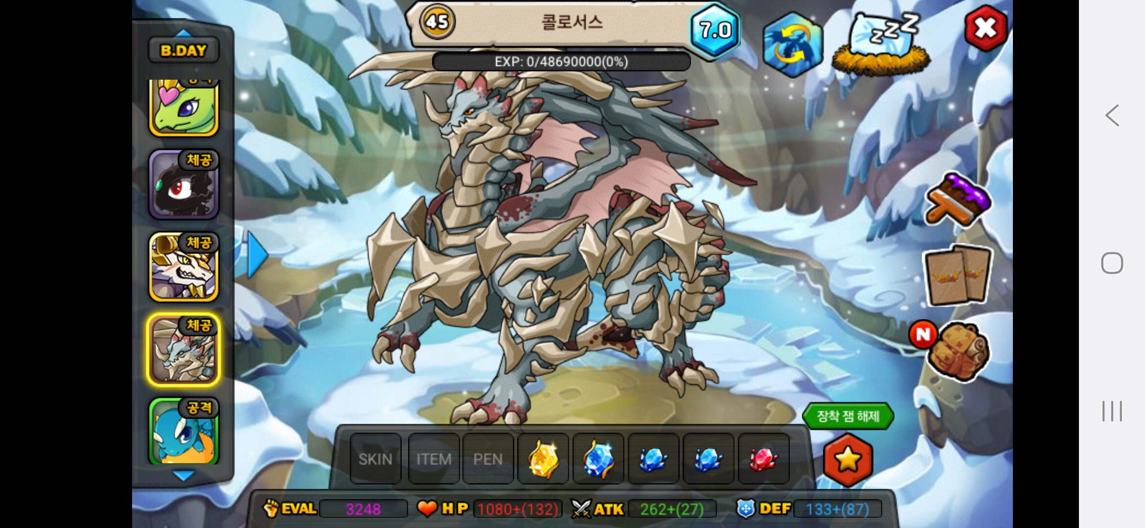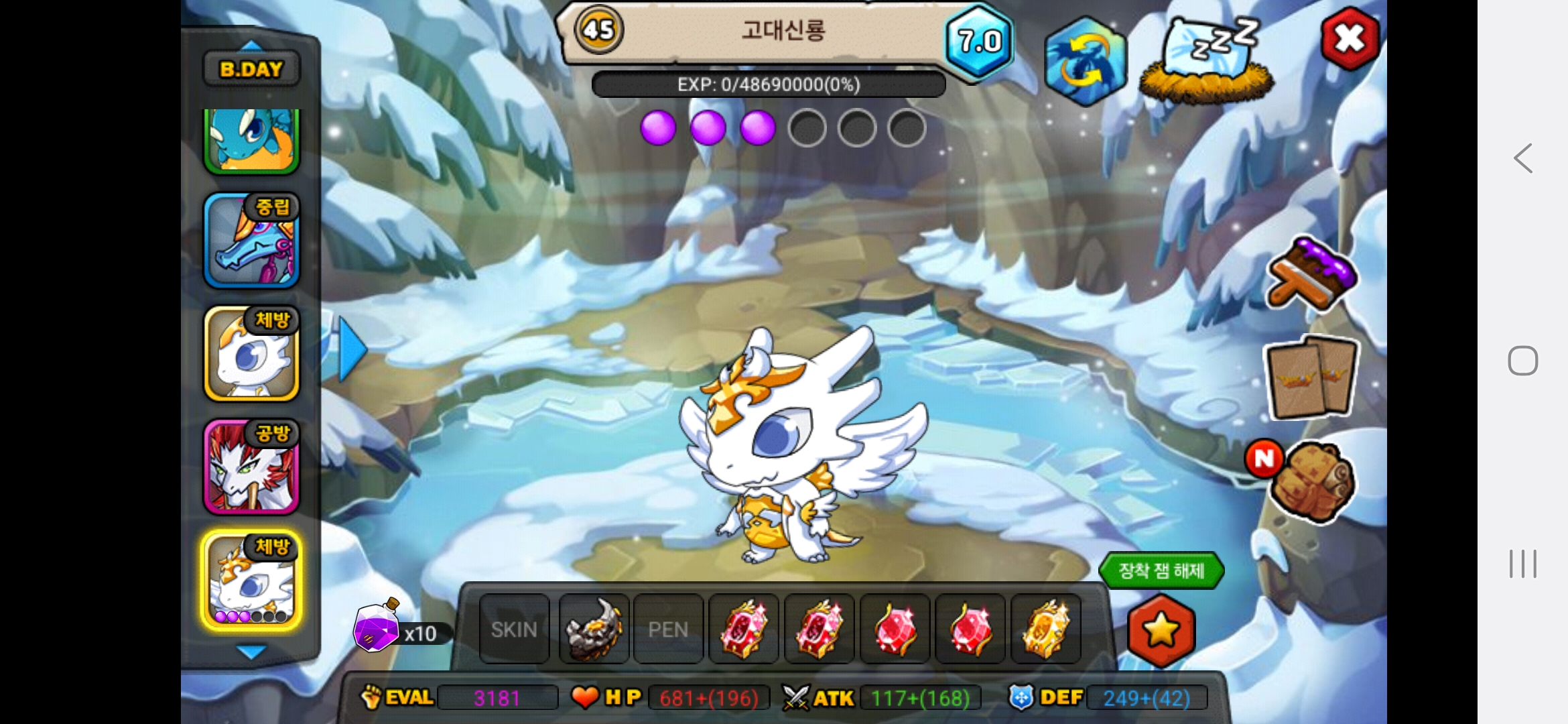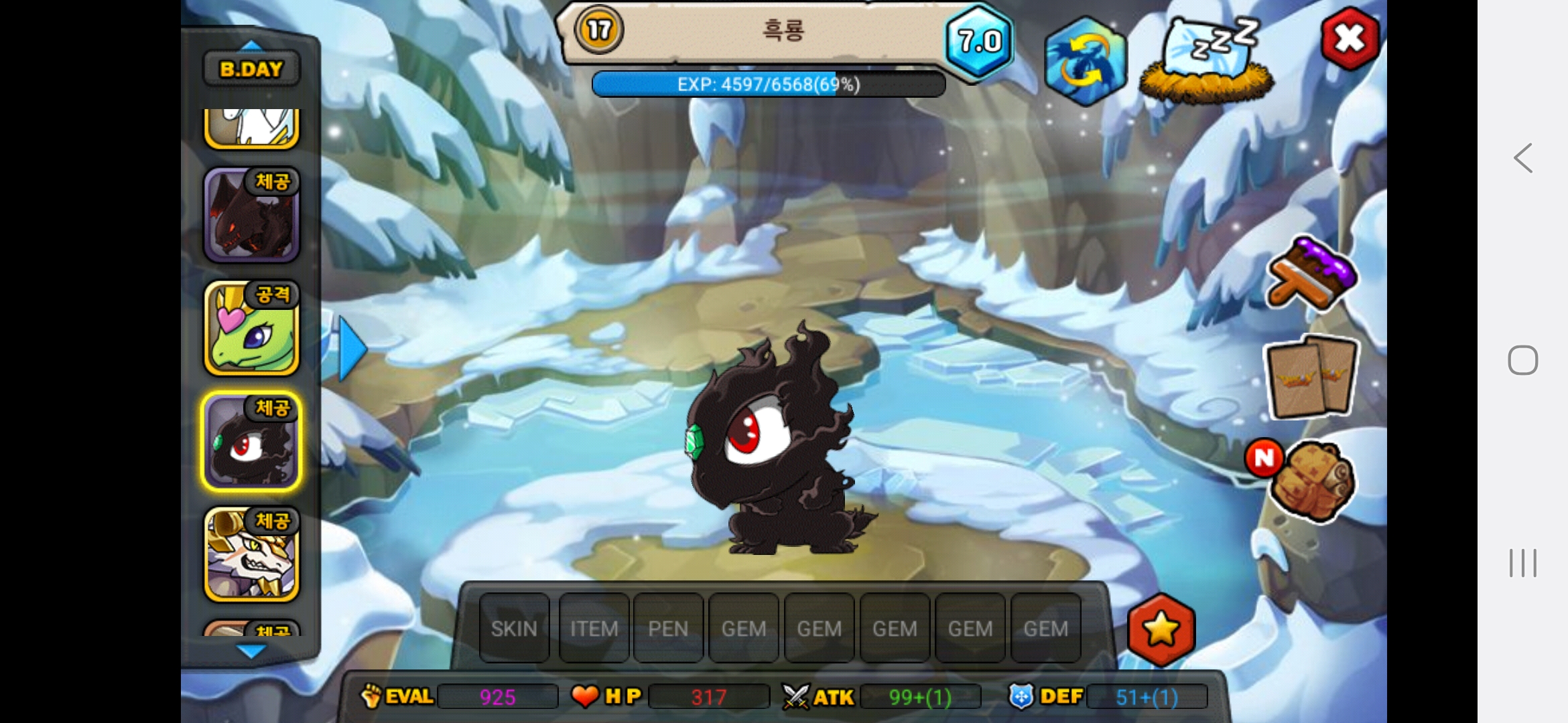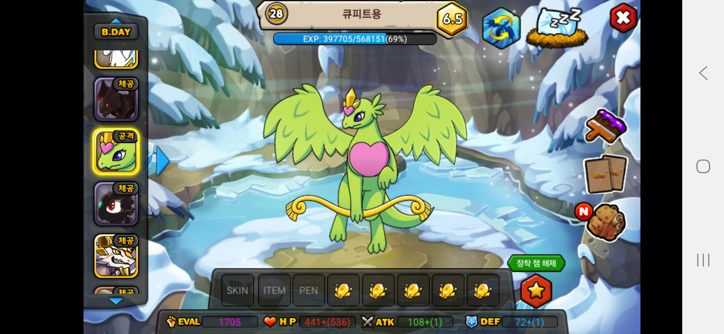 올해아직생일이 2월생이라 생일안지나서 25이죠 아직 하하저는 용들 다평등하게 예뻐합니다.다만 고대신룡을 전 계정에서 진각성시킨것을 전화번호바꿔서 계정날려서 그런것을 후회합니다.그래서 고대신룡에게 애정과 관심을 더주고싶은건사실입니다.흑룡을 키웠을때는 지금처럼 노력과 피와땀이 안보여서 키우는데 재미가없고 자본으로 승부하는맛밖에 안보이다보니 키우는게 재미가없더라고요 그래서 흑룡한테는 관심이 덜가고 걱정이덜되는게사실입니다. 고대신룡은 제첫 각성드래곤이기도 하고 그래서 예쁩니다.하지만,그래도 저는 흑룡,고대신룡,포메쿨,청룡,엔젤드래곤,엔젤드래곤,엔젤드래곤,엔젤드래곤,청룡,메라크,즈믄,콜로서스,다크닉스,