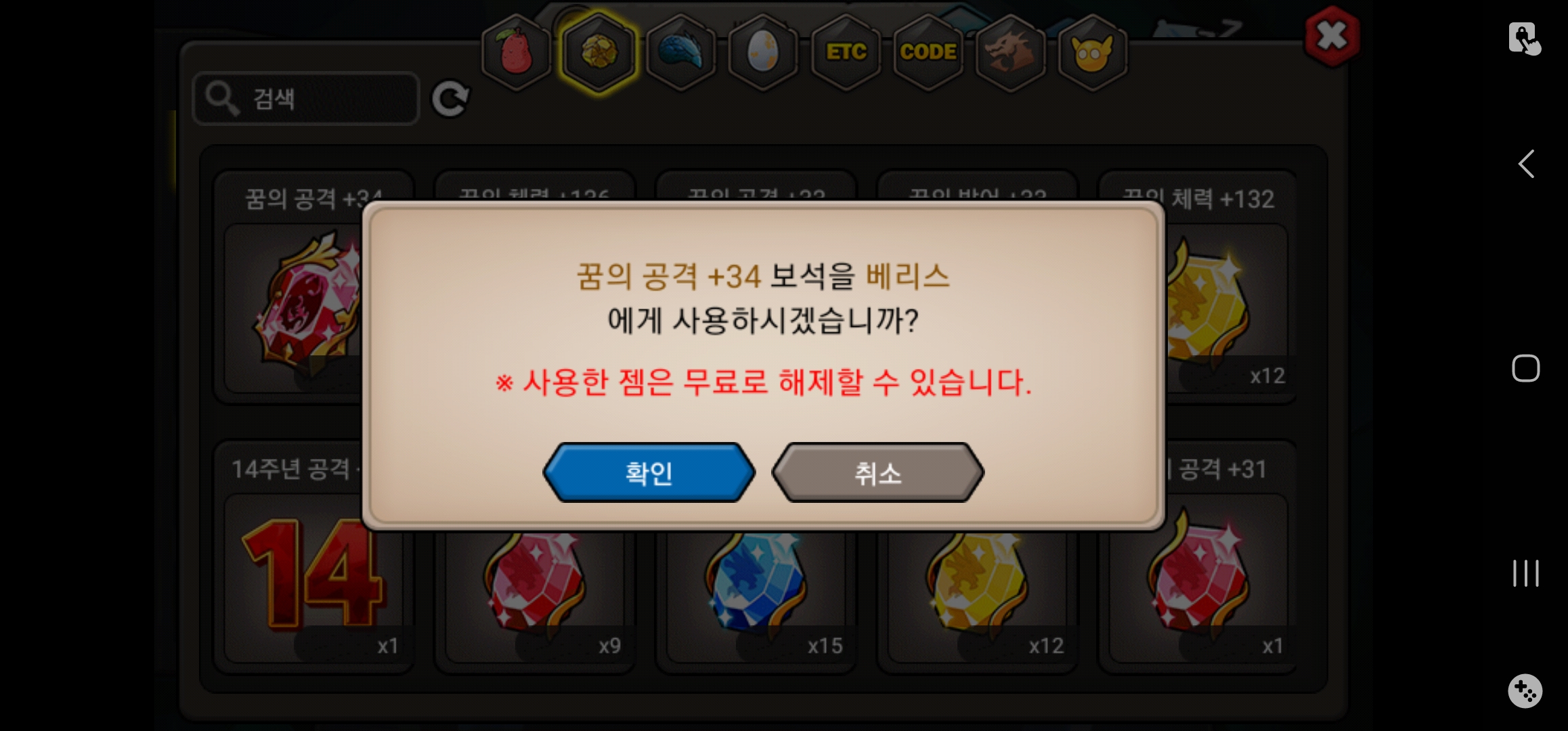 이 화면에서 확인 눌러도 용에 젬이 안 붙어요