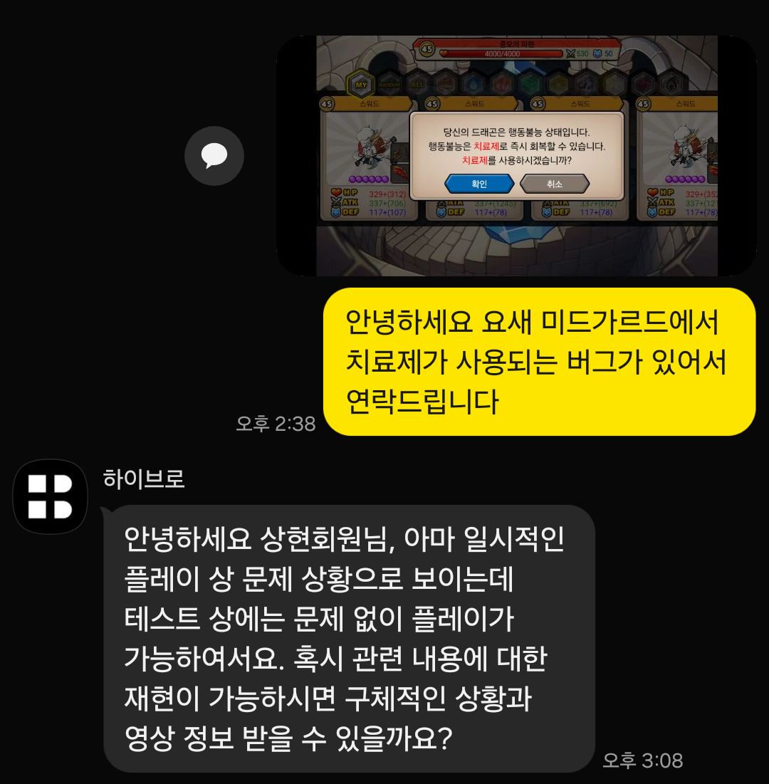 어제도 비슷한 상황에서 문제가 생긴듯한데 원래 클리어가 안되는 스펙도 아니고 치료제가 실제로 사용된 상황이라면 악용이 아닌 손해를 본 상황같아 문의 남겼습니다.