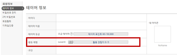 - 홈페이지 레벨 및 포인트는 [테이머정보 > 활동 레벨]에서 확인 가능합니다.