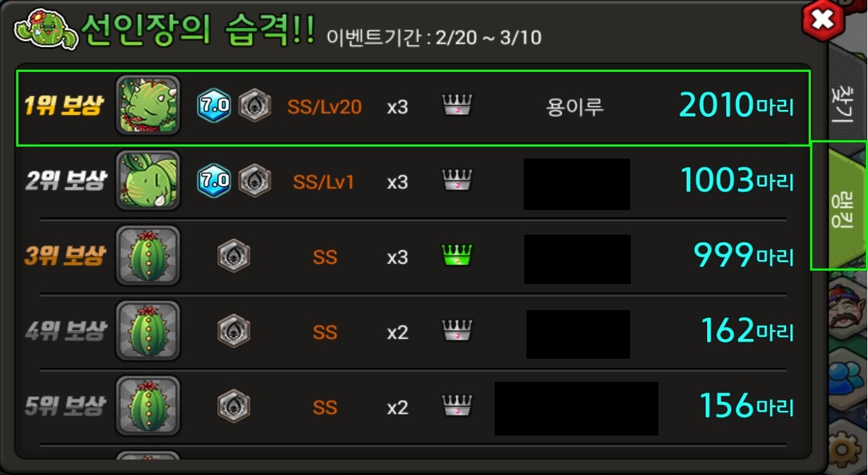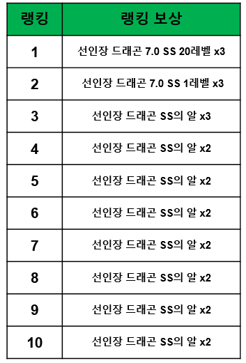 - 동일한 마리수 (순위)가 되었을 경우 달성한 순서대로 랭킹이 적용되어 보상이 지급됩니다.