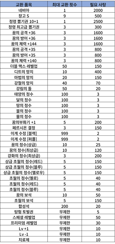 신규 드래곤 "장고"를 비롯하여 네비아와 각종 아이템들을 교환할 수 있습니다.