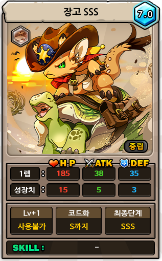도감 설명 : 세상을 혼란스럽게 하는 이들을 혼쭐내어 자신의 가치를 증명하고자 한다. 정의감으로 약자를 보호하는 보안관이다. 재빠른 몸놀림과 전투 실력으로 혼란을 가져오는 이들을 물러가게 한다. 자신을 생명의 은인으로 여기는 거북이, 프랭크와 함께 자신의 오랜 숙적인 에슈를 뒤쫓고 있다. [획득처: 2025 할로윈 이벤트]