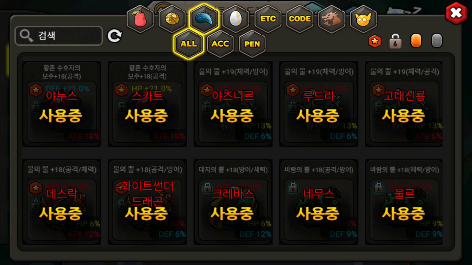 - 인챈트를 진행한 장신구, 드래곤에 장착된 장신구는 잠금/즐겨찾기 설정한 장신구와 같이 별도 노출됩니다.