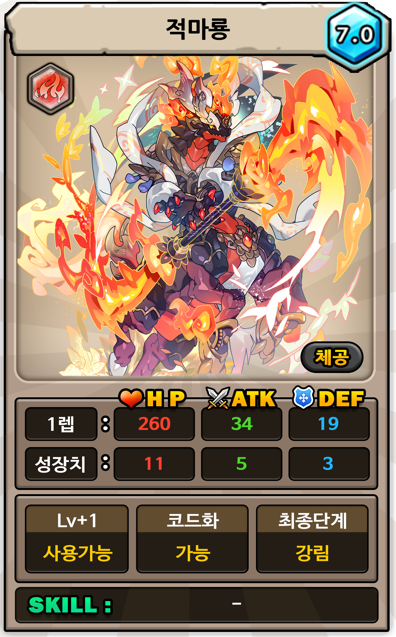도감 설명 : '적화'라고 불리는 불꽃으로 사악한 것을 정화하고, 새로운 생명이 돋아나게 하여 자연을 순환시킨다. 붉은 평원뿐 아니라, 토호우 대륙 전체를 달리며 정화의 불꽃을 피운다. 성체가 된 적마룡의 불꽃은 평범한 생명에는 영향을 주지 않고, 오염된 것이나 사악한 것들에게만 영향을 끼친다. [획득처: 14주년 전야제 이벤트]