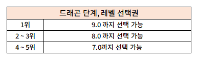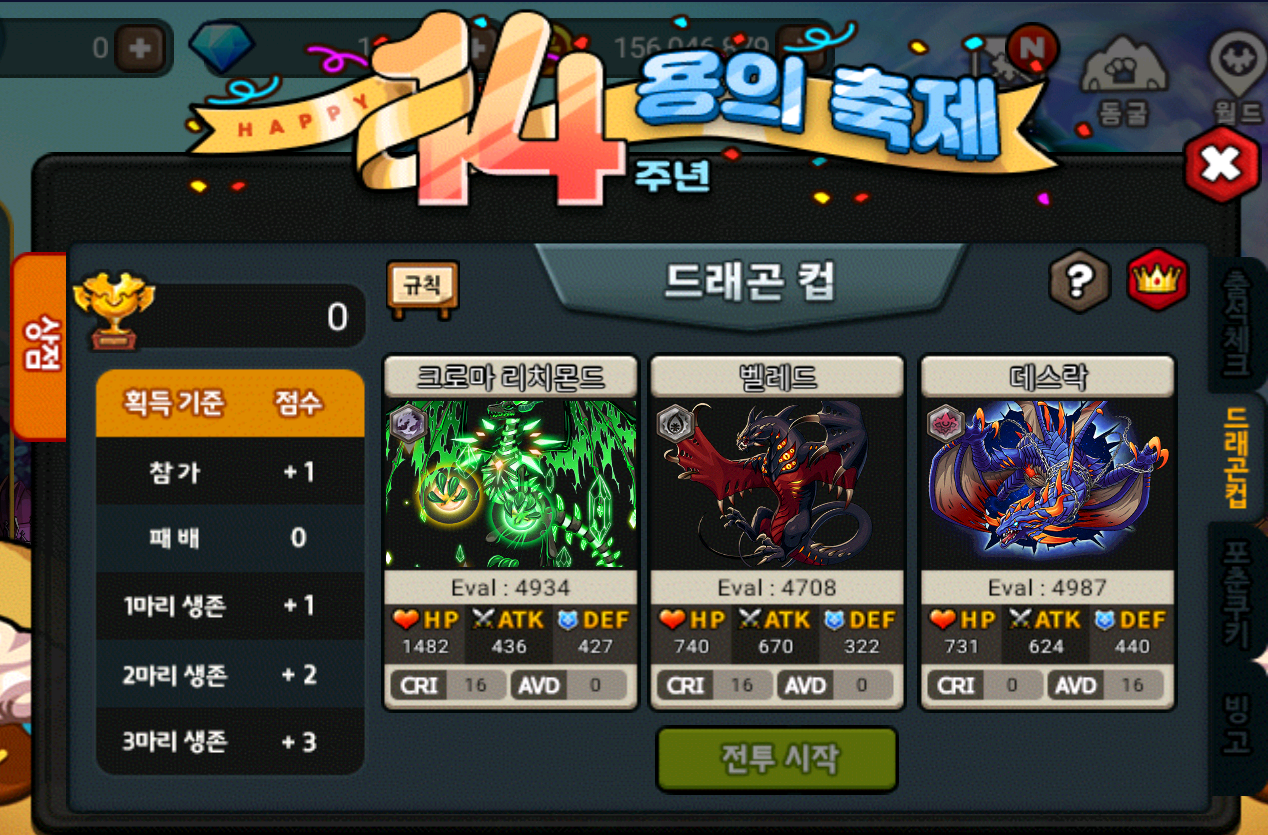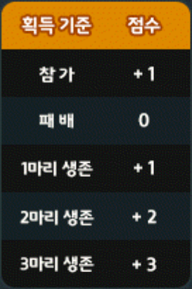※ 점수는 참가 시 1점, 승리 시 생존한 드래곤의 숫자에 따라 추가 점수를 획득합니다.