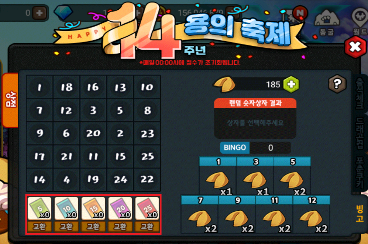 5. 빙고판은 매일 00시에 초기화되며, 기존에 보유한 숫자 상자도 초기화 됩니다.