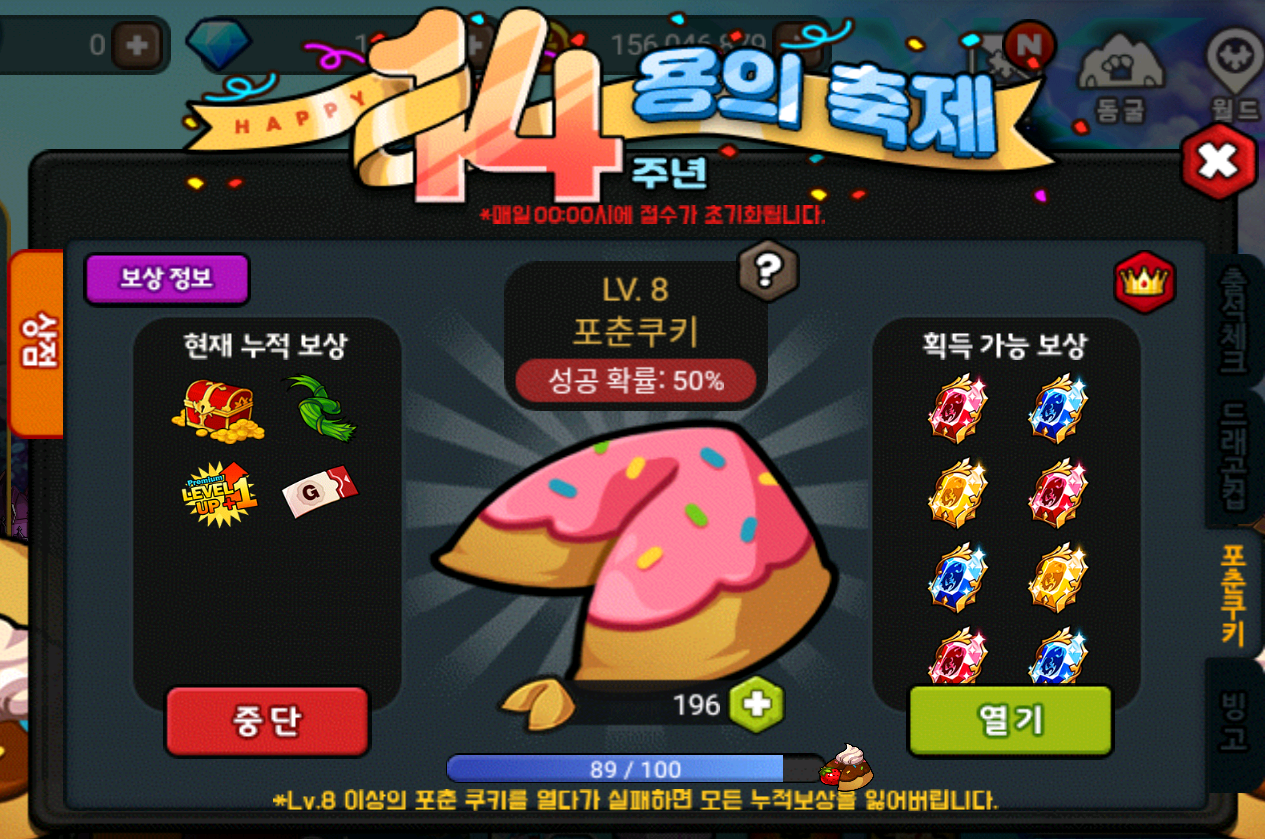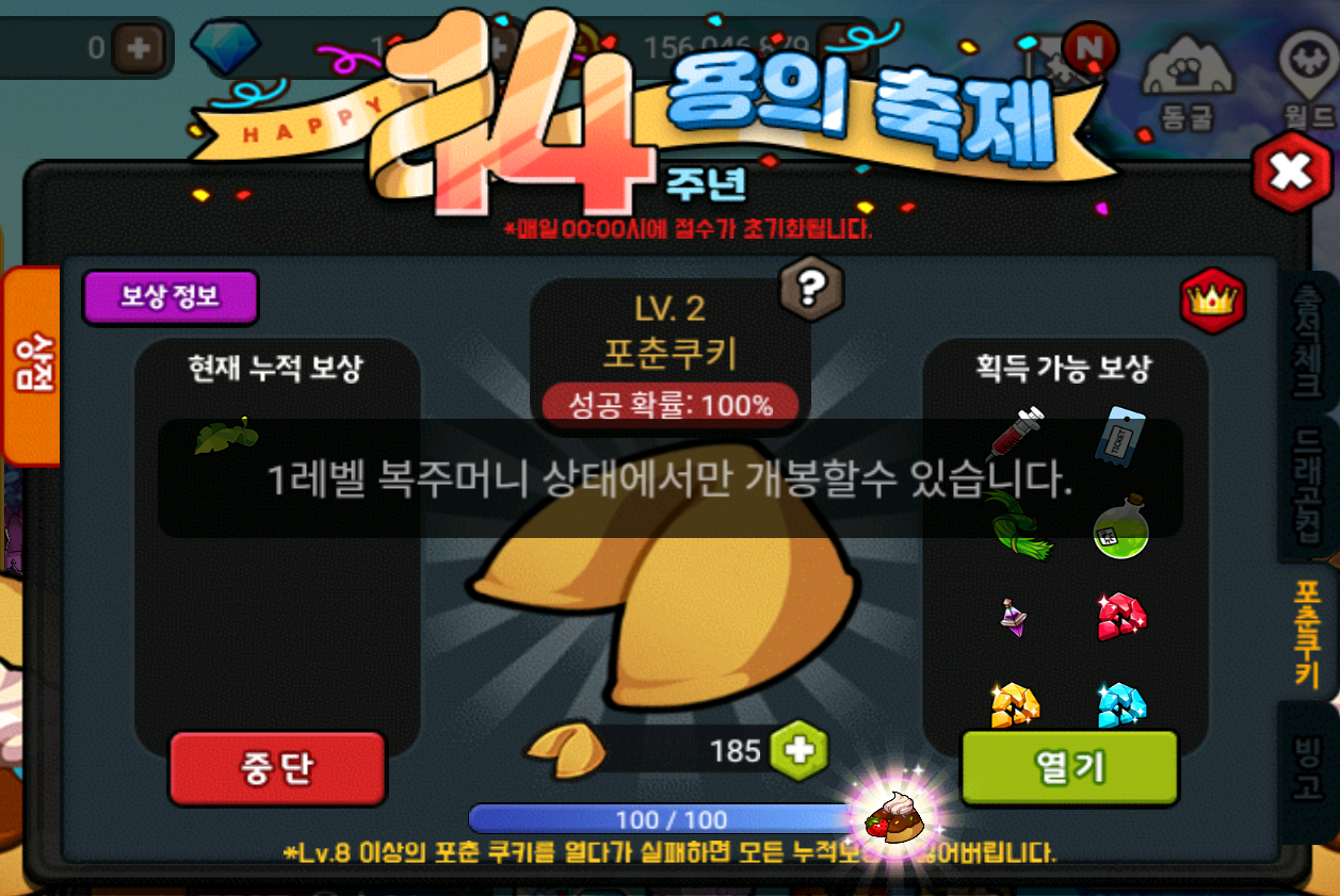 - 단, Lv.8 포춘 쿠키부터 개봉에 실패 시 누적된 아이템이 소멸됩니다.
