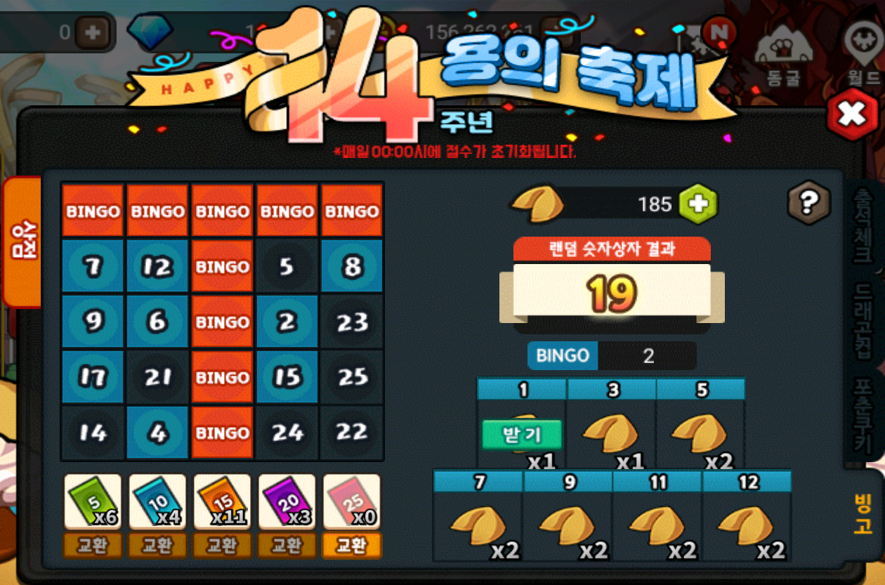 4. 빙고를 완성하면 완성한 수에 따라 포춘 쿠키를 얻을 수 있습니다.