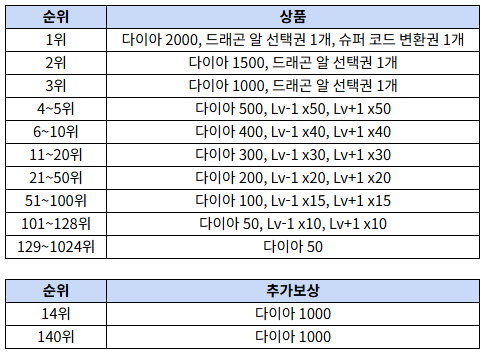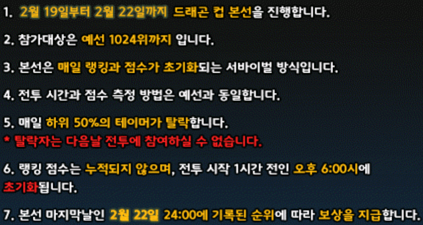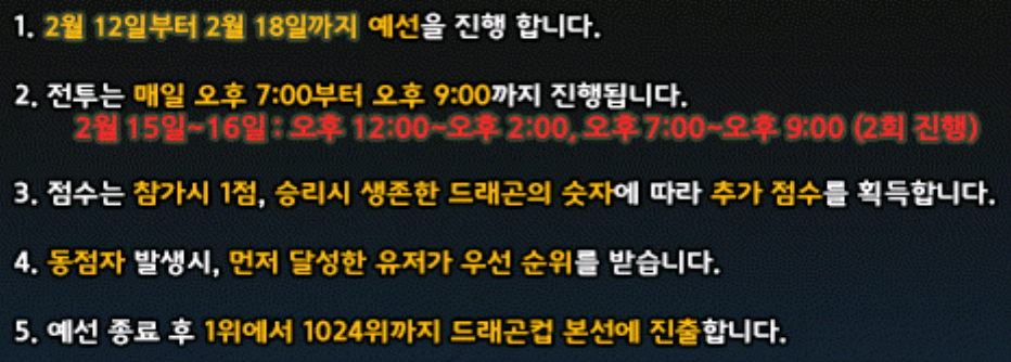 ※ 예선 종료 후 1위부터 1024위까지 드래곤 컵 본선에 진출 하게 됩니다.