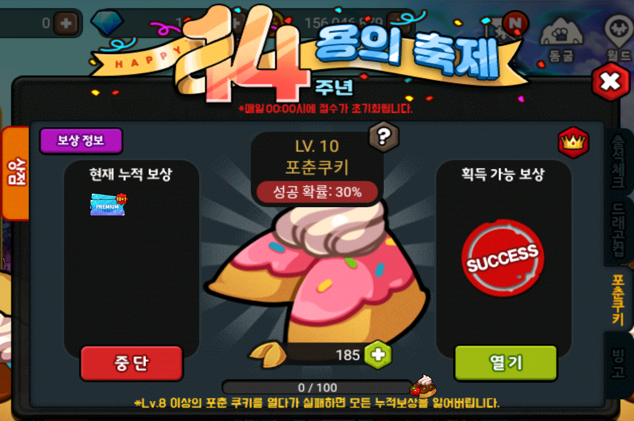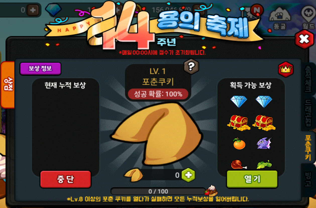 - Lv.7 이전까지는 열기에 실패해도 포춘 쿠키 보상을 모두 획득하실 수 있습니다.