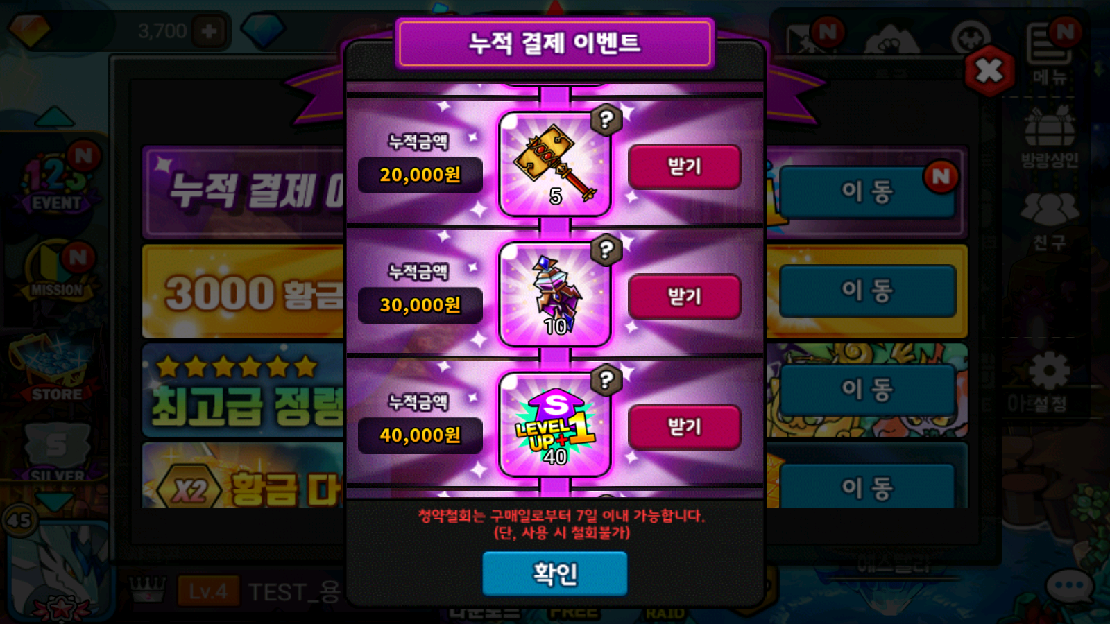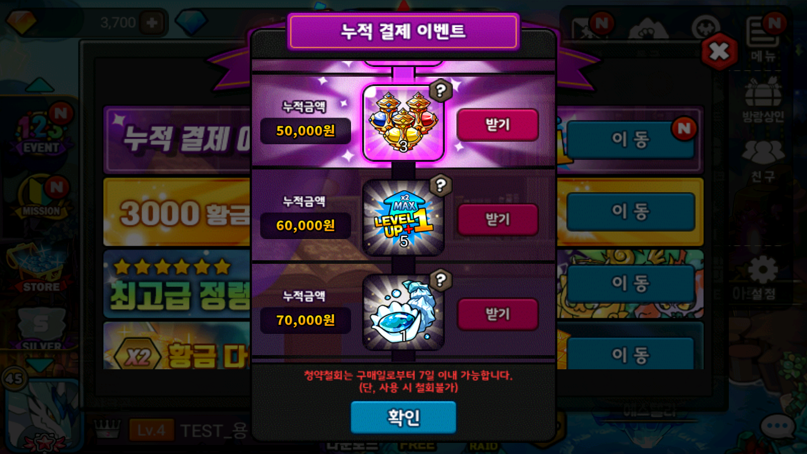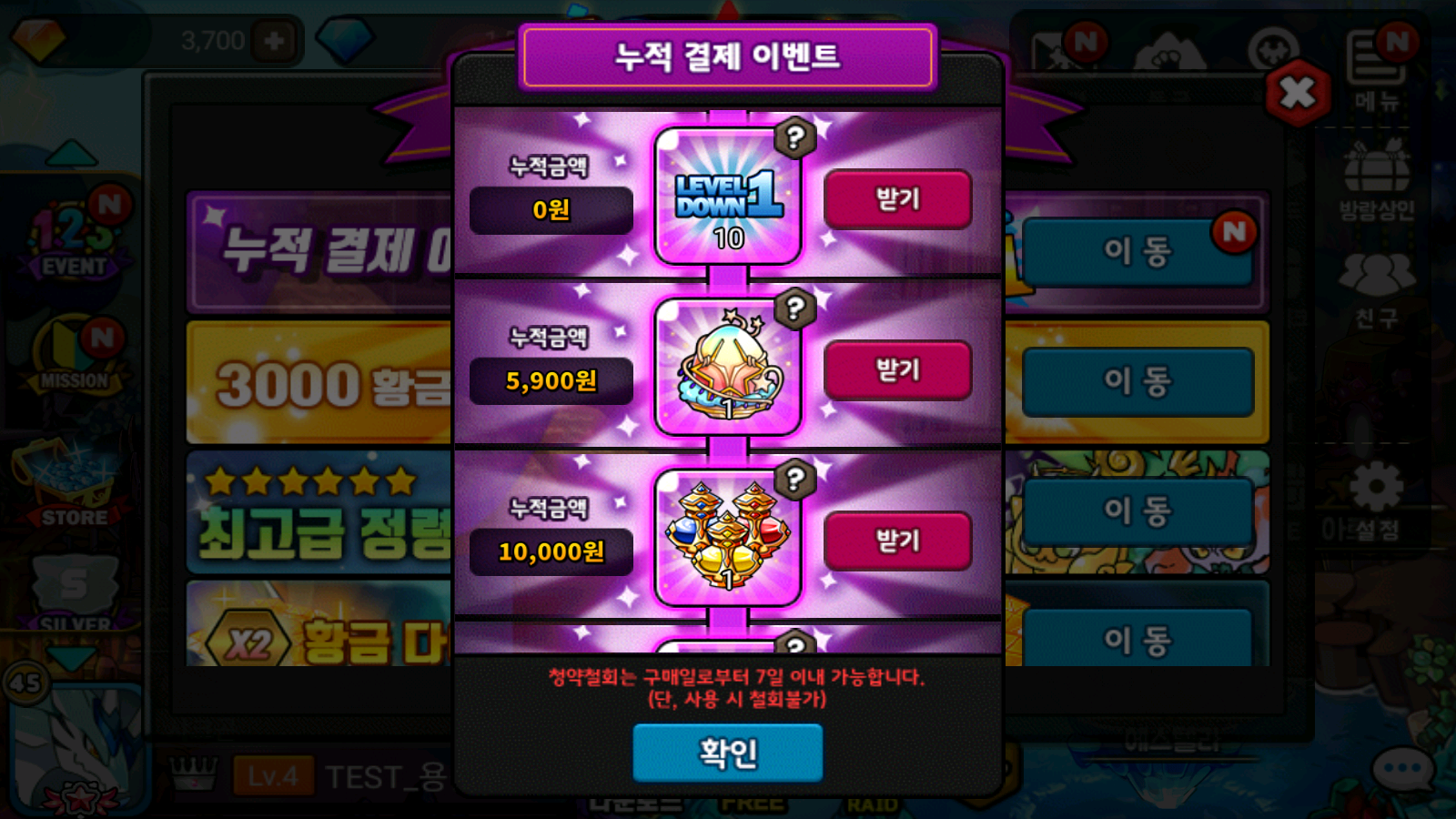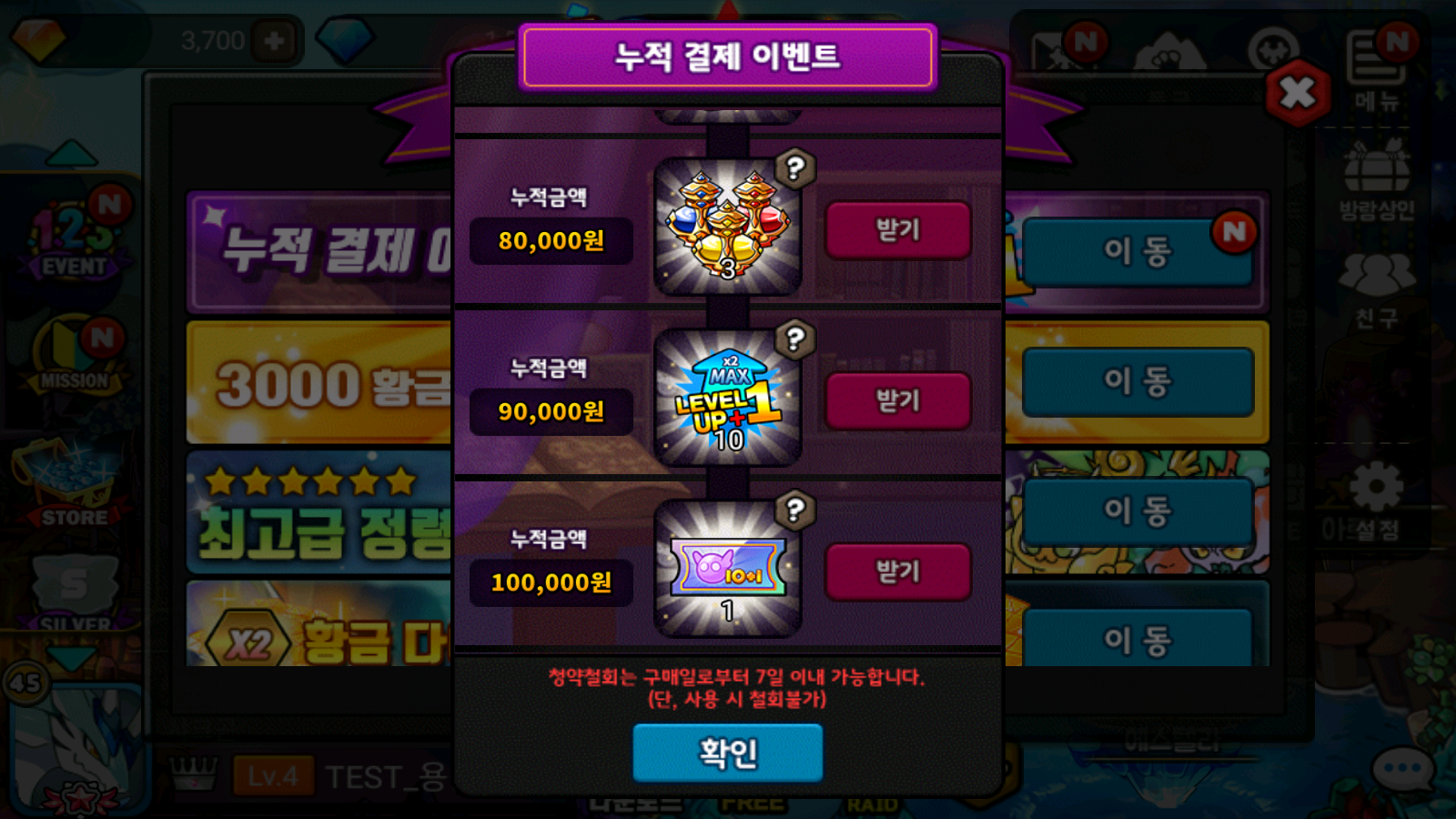 예: 프리미엄 월정액 (12,000) 결제시 누적 금액 10,000 달성하여, [꿈의 부화기+1 1개] / [상급 초월의 정수 1세트] 받기 가능.