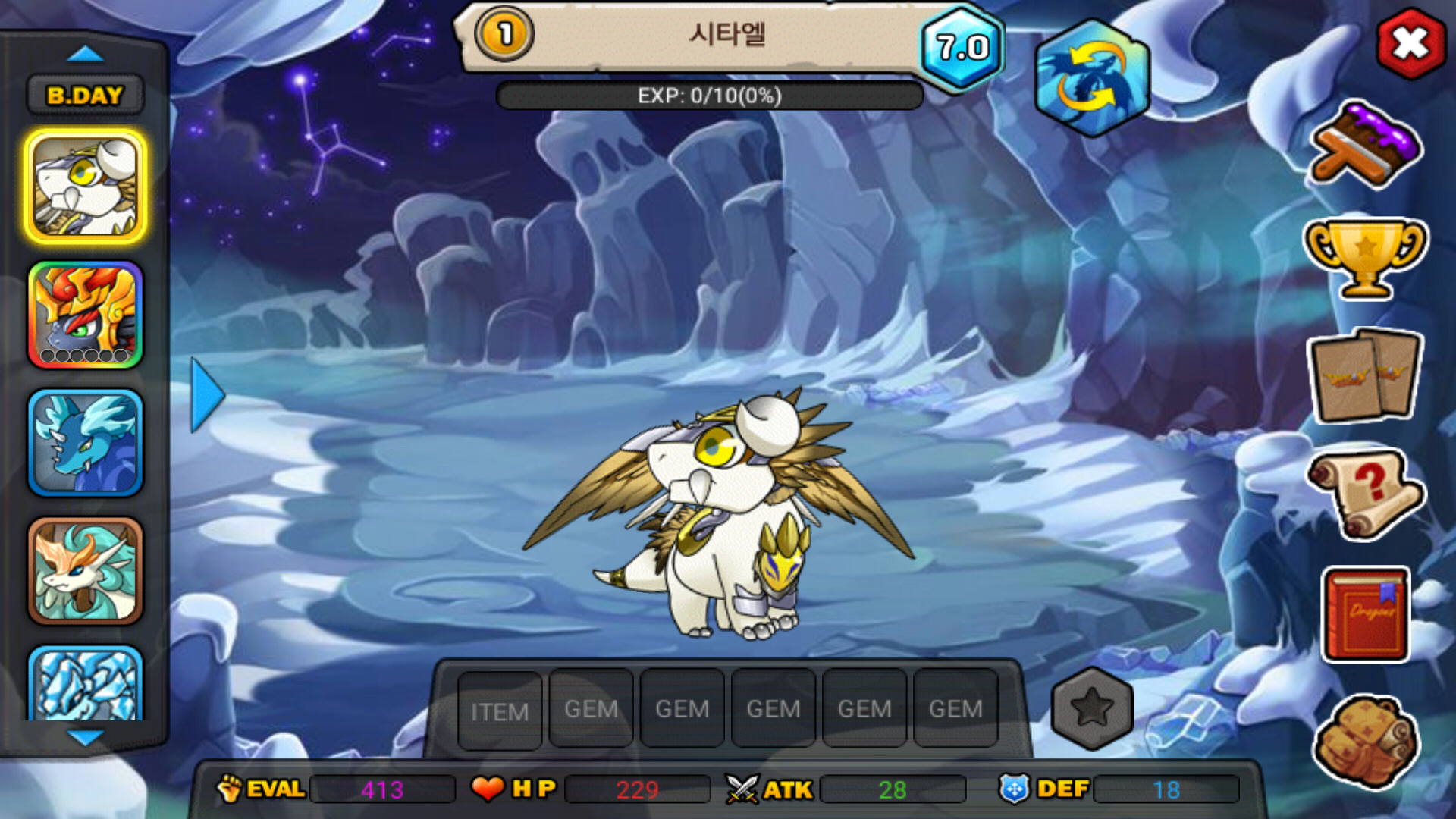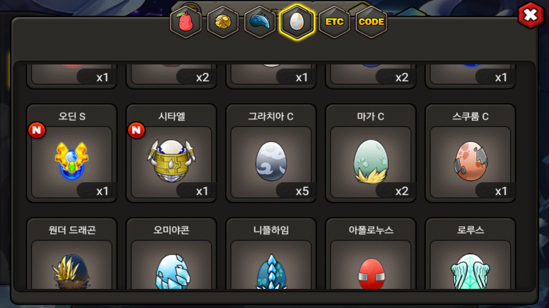 복주머니 500개로 시타엘교환후 복귀보상2일차 꿈부+1로 부화..