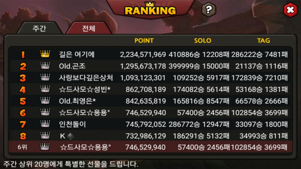 어제저녁 월드랭킹 6위 달성하며 레젼 영은님 백허그에 성공하였습니다^^