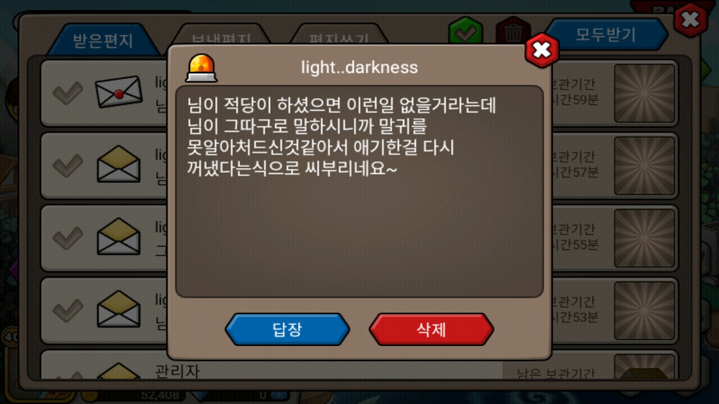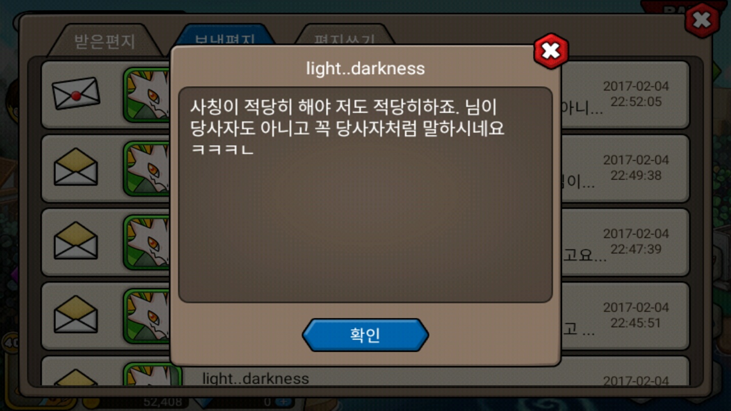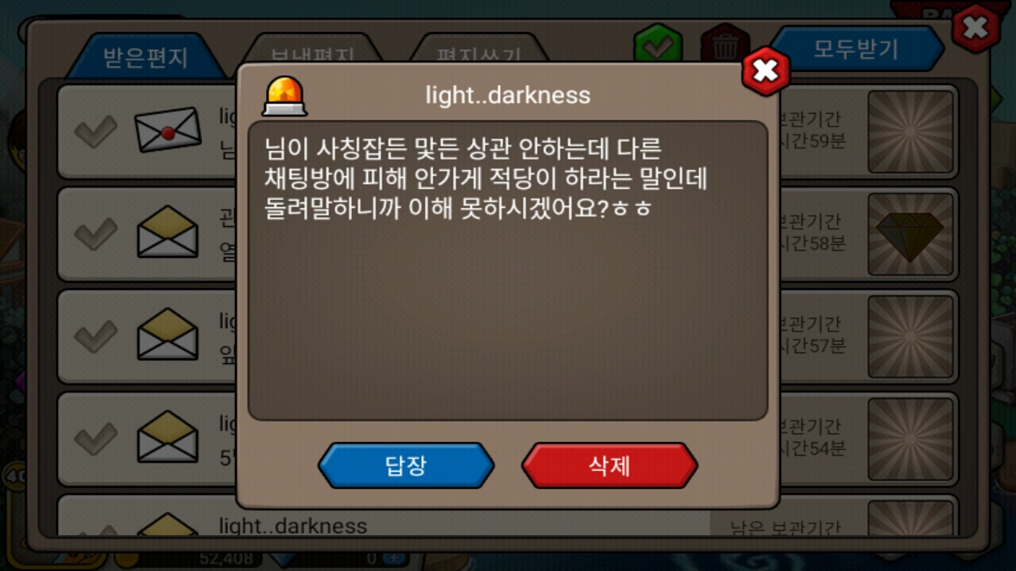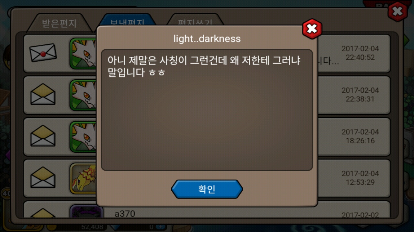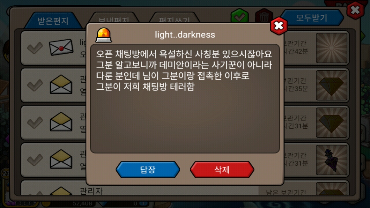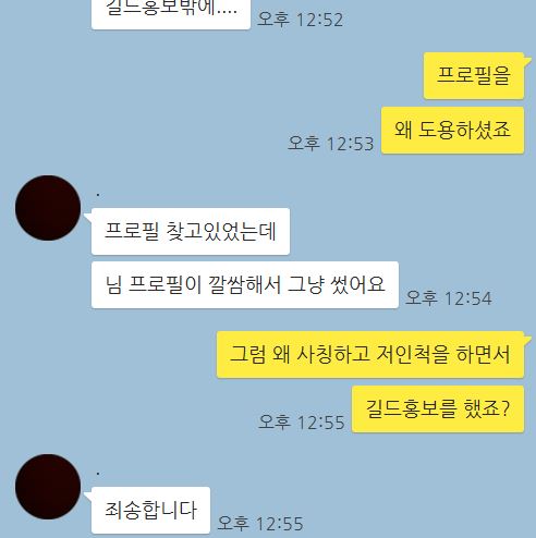 이런답장이 왔습니다. 저가 사칭을 의심하고 구박한 뒤로 채팅방을 테러당했다