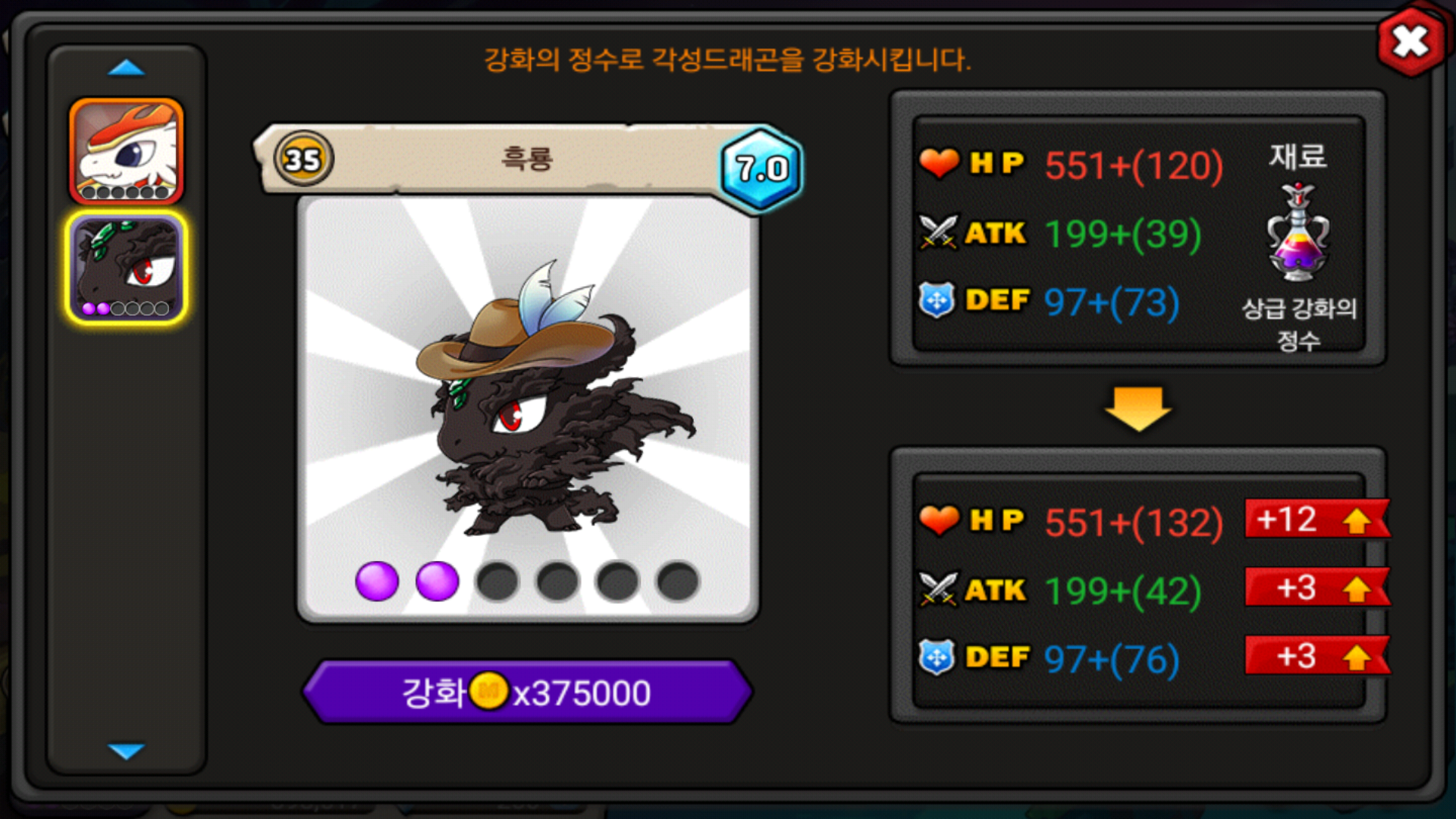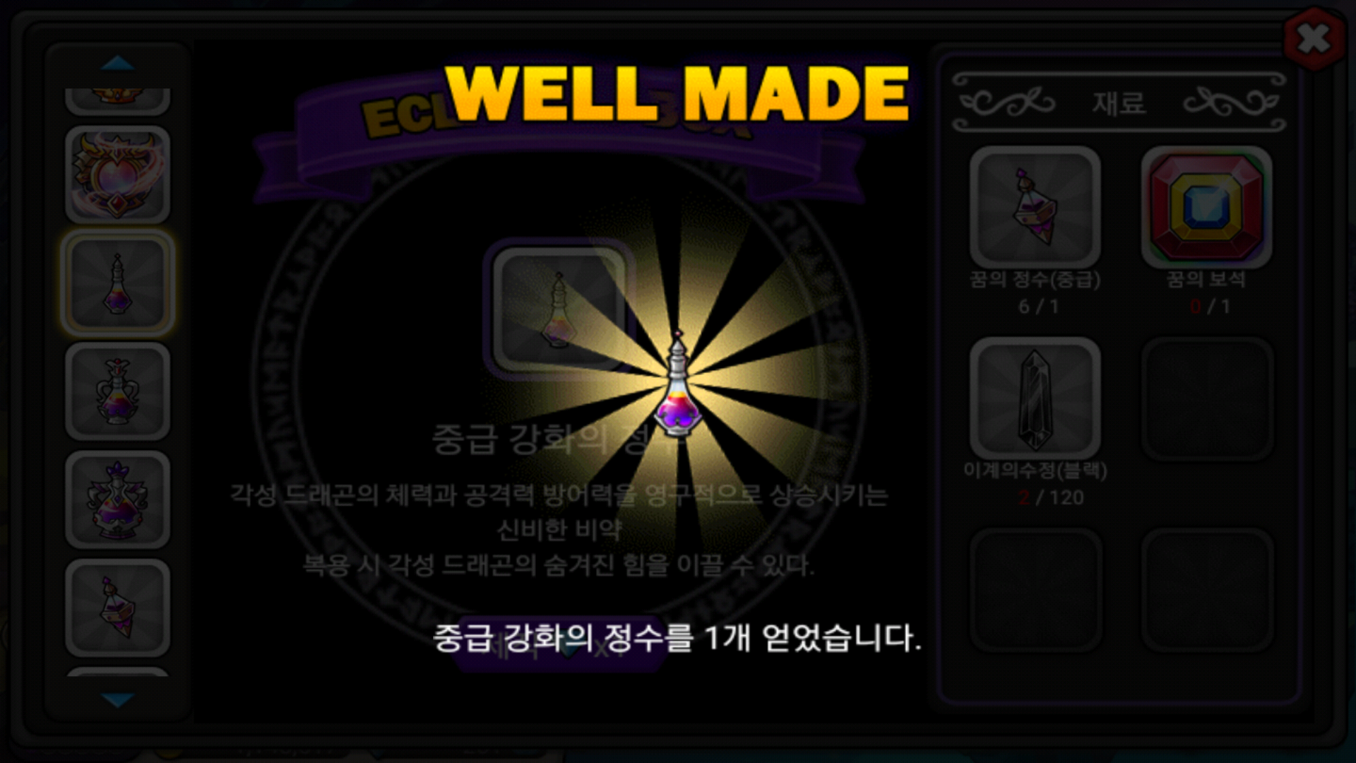 오늘 출첵 보상으로 꿈의 보석 받고 모든 재료가 다모여 드디어 2강에 성공했습니다!! 빨리 30렙 기준 풀강인 4강찍고 싶네요..ㅠ 이제 재료모으는것도 힘들텐데...