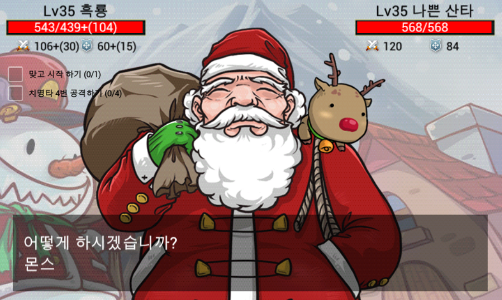 이분 진짜 추억이네여... 저때 박카스 안먹이면 전부 MISS떴었죠....... 눈꽃결정이란게 희귀했던 시절...그 다음해인 2013년때도 있었던걸로 아는데 뭐 그땐 박카스를 먹든 안먹든 공격이 잘 먹혔고... 그 이후로 모습을 감춘 나쁜 산타씨......... 그리고 아마 이때가 드빌 리즈시절이 아니었나 싶네요....