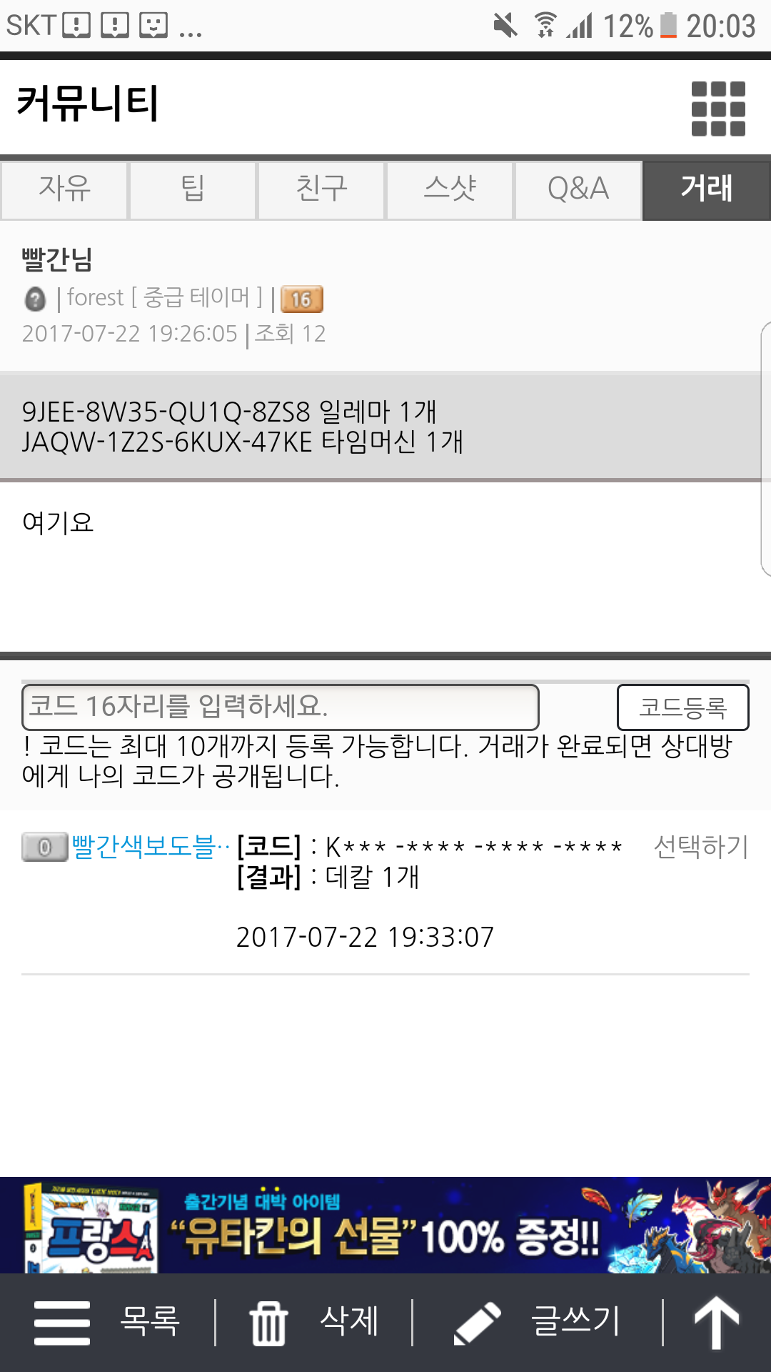 그 후에 거래게시판에 들렸는데 홈페이지 오류가 심하게 나서 어쩔수없이 카톡으로 거래했습니다