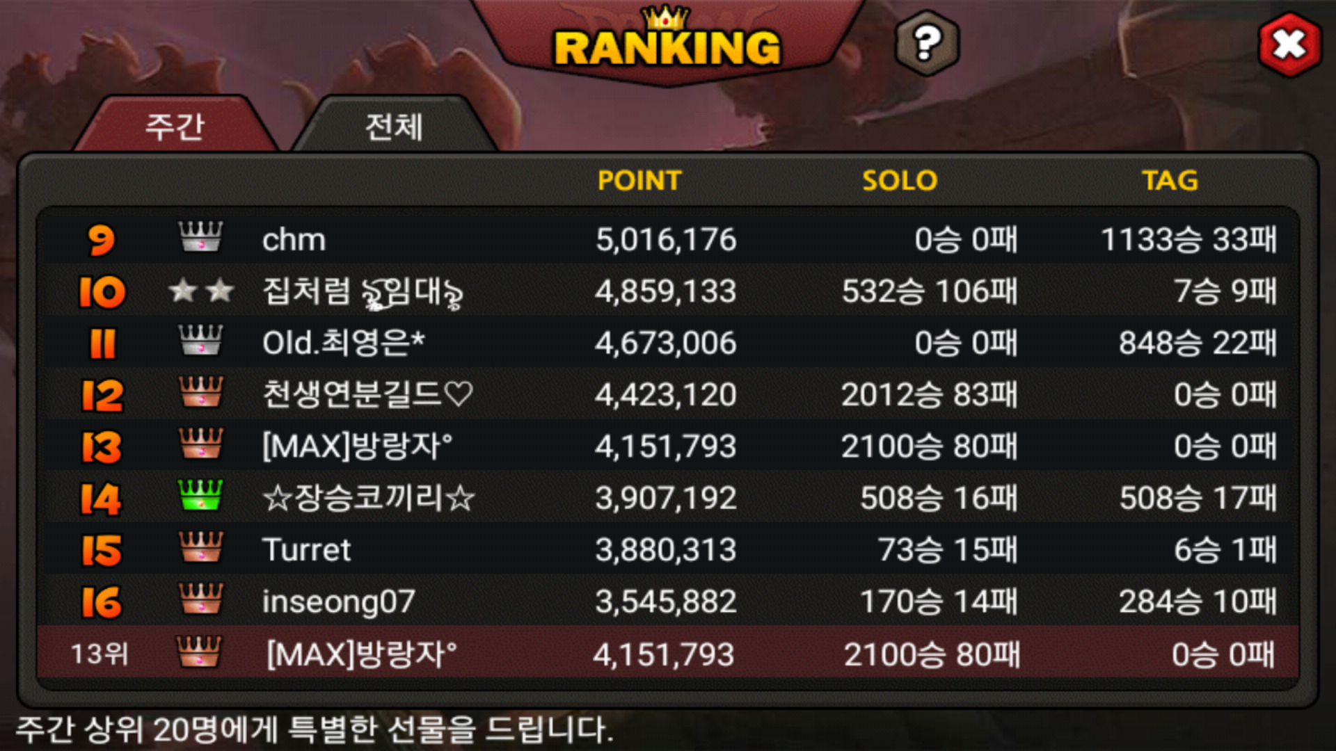 솔로로 주랭을 뛰는중인 방랑자인데 아무리 열심히해도 10위권가기조차 힘듭니다ㅠㅠ 렙다작이나 태그도시는분들 따라가기 정말힘드네요 그래도 렙다작 사라진다니 10위권이 가능하련지.. 여러분도 즐겜하세요