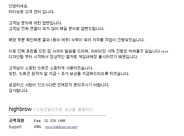 제 메일이 누락되어서 인게임에 나오게 된걸 제 친구를 통해 알게되었고 문의를 통해 리바이어던 삭제를 요청했더니 저 사진처럼 메일이