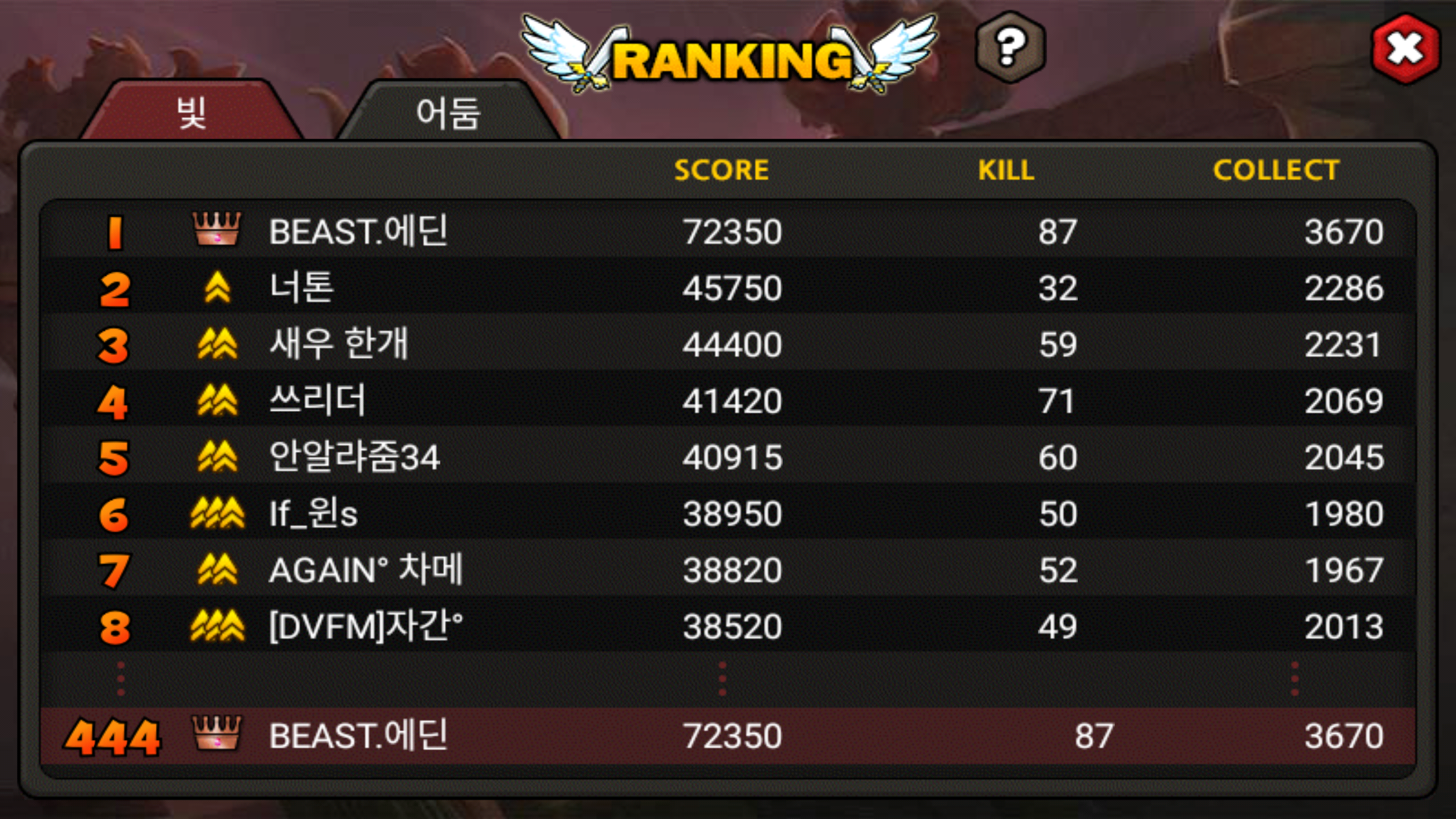 안녕하세요 11월 11일 전쟁 빛진영에서 1등으로 끝낸 BEAST.에딘 입니다