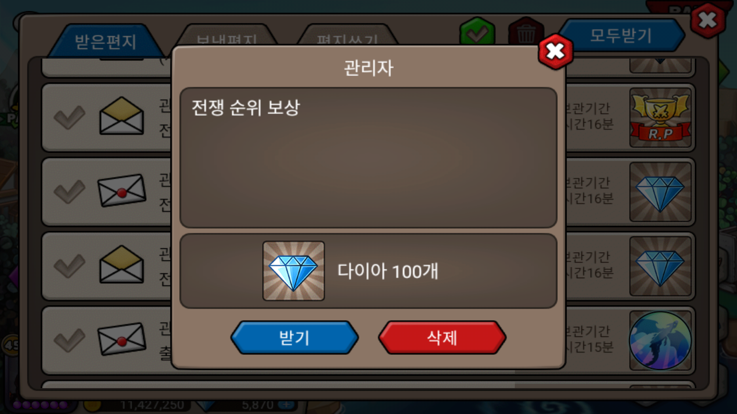 아래는 우펀함에 들어온 전쟁 승리보상입니다