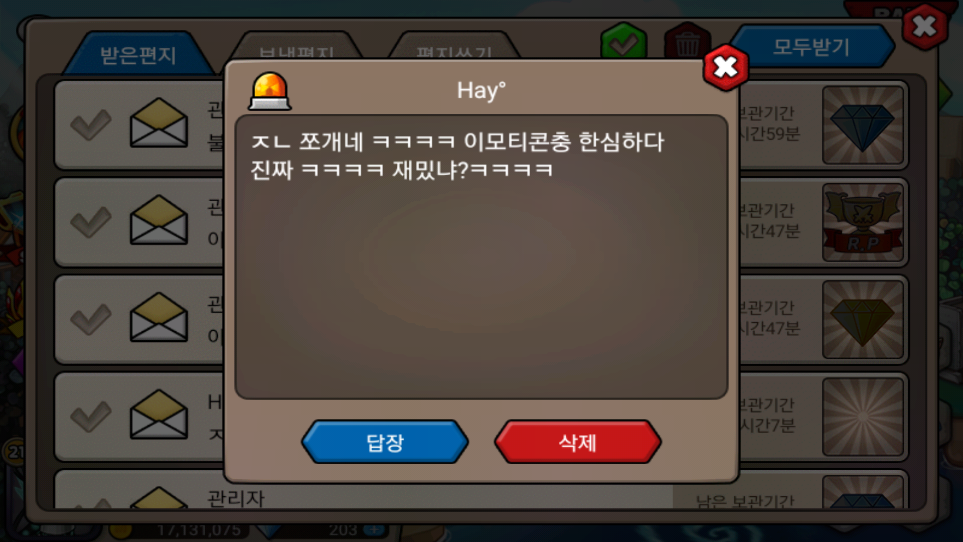 저 오늘 한번도 이모티콘 쓴 적이 없거든요..갑자기 편지로 뜬금없이 화내시네요..하..제가 플그SS로 21층 돌렸습니다.드빌 닉네임으로 성우°입니다.저랑 붙으시면서 이모티콘 쓴거 보신분들 연락 부탁드립니다..