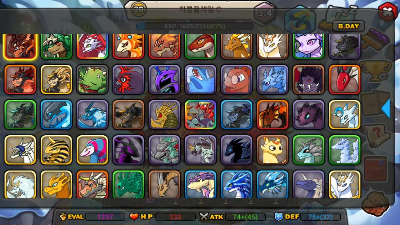 그동안 열심히 육성해온 드래곤들을 한번에 보니 각양각색으로 다양합니다. 물론 더 있지만 50마리 정도 꺼냈습니다.