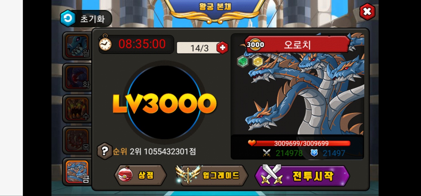 왕방 업그레이드 업뎃 이후 오랜만에 오로치를 이래도되나 싶을 정도로 때려보았는데 1,000,000,000점을 돌파해도 1위가 되지 않아 스탑하였습니다...;;