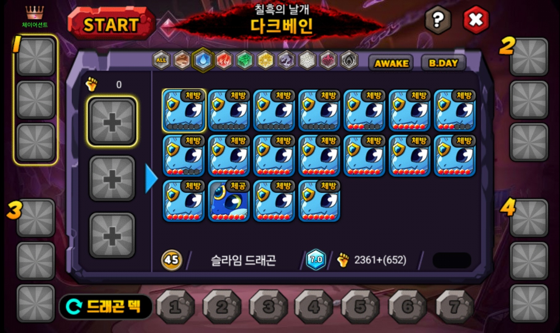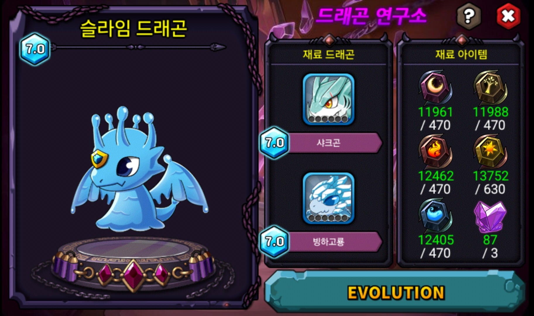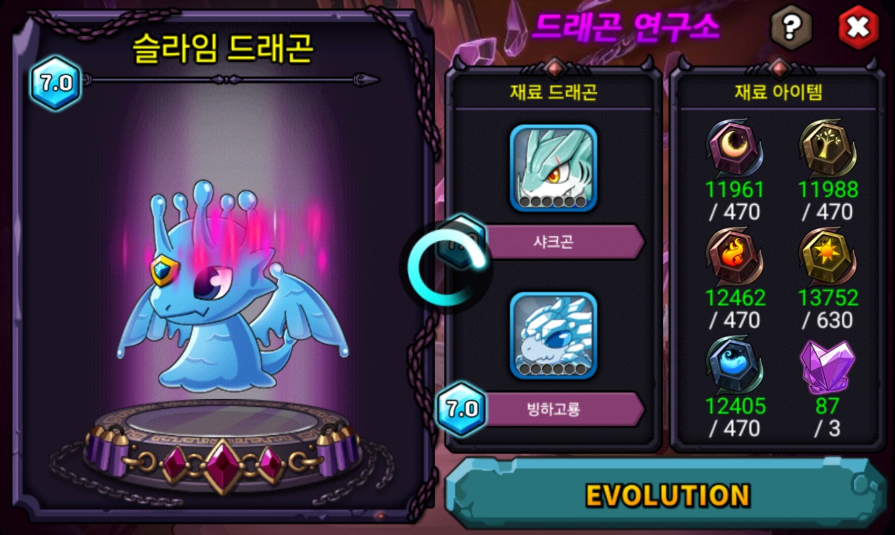 현재 히드라곤 1마리, 블루라이트닝 1마리, 슬라임 드래곤, 17마리, 스켈레곤 1마리 진각성 보유중입니다.