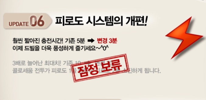 콜로세움에 피로도를 붙이다니...그리고. 늘어났다고 좋아할게 아니였어요.. 이제 피로도2를 소비하니 한번게임하려면6분을 기다려야 한다는거죠....다행히 이번업데이트에서는 안나오지만....잠정보류라니?? 그럼다음 업뎃에서는 이게 추가될수도 있다는건가여?? 아니 참. 추가를 할거면 추가하던가 아니면 아예 싹갈아치우던가요.....