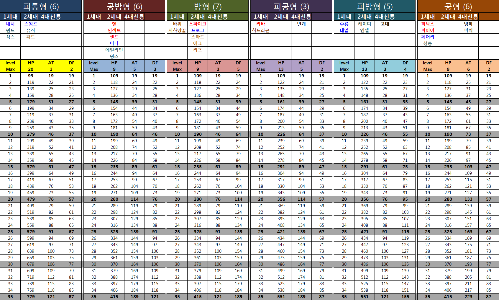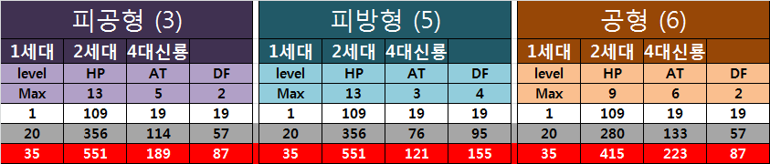 예를 들어 위의 표는 보통 많이 평가하는 lv. 1, 20, 35때의 풀스탯을 다시 한번 형태별로