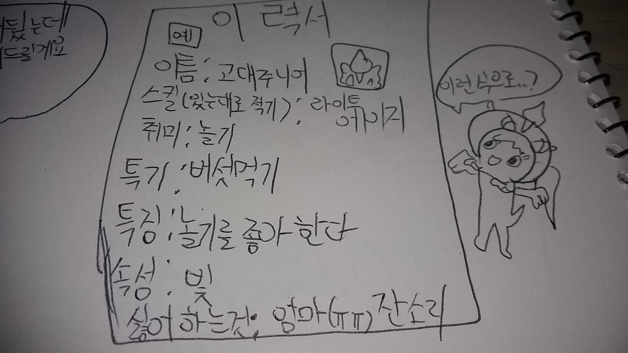 이름,속성,특기,취미,특징,스킬,싫어하는것