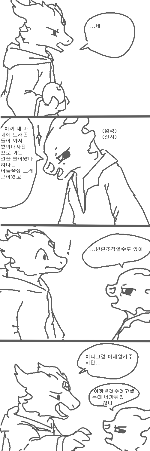 어둠드래곤이 빛의대사관에 가려고한다는걸알고 수상하게생각해서 백룡한테 말해주러 갑니다