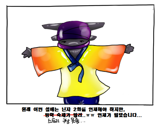 방학이 끝나가면서 밀렸던 숙제도 하고.... 설 연휴도 있어 바쁜 나날들을 보냈습니다. 또 닌자 2화 스토리가 잘 생각나지 않아, 연재또한 미루어졌습니다... 다음 번엔 꼭 올리도록 노력하겠습니다... 닌자를 사랑해주시던 구독자분들 감사드리고, 새해 복 많이 받으세요~~