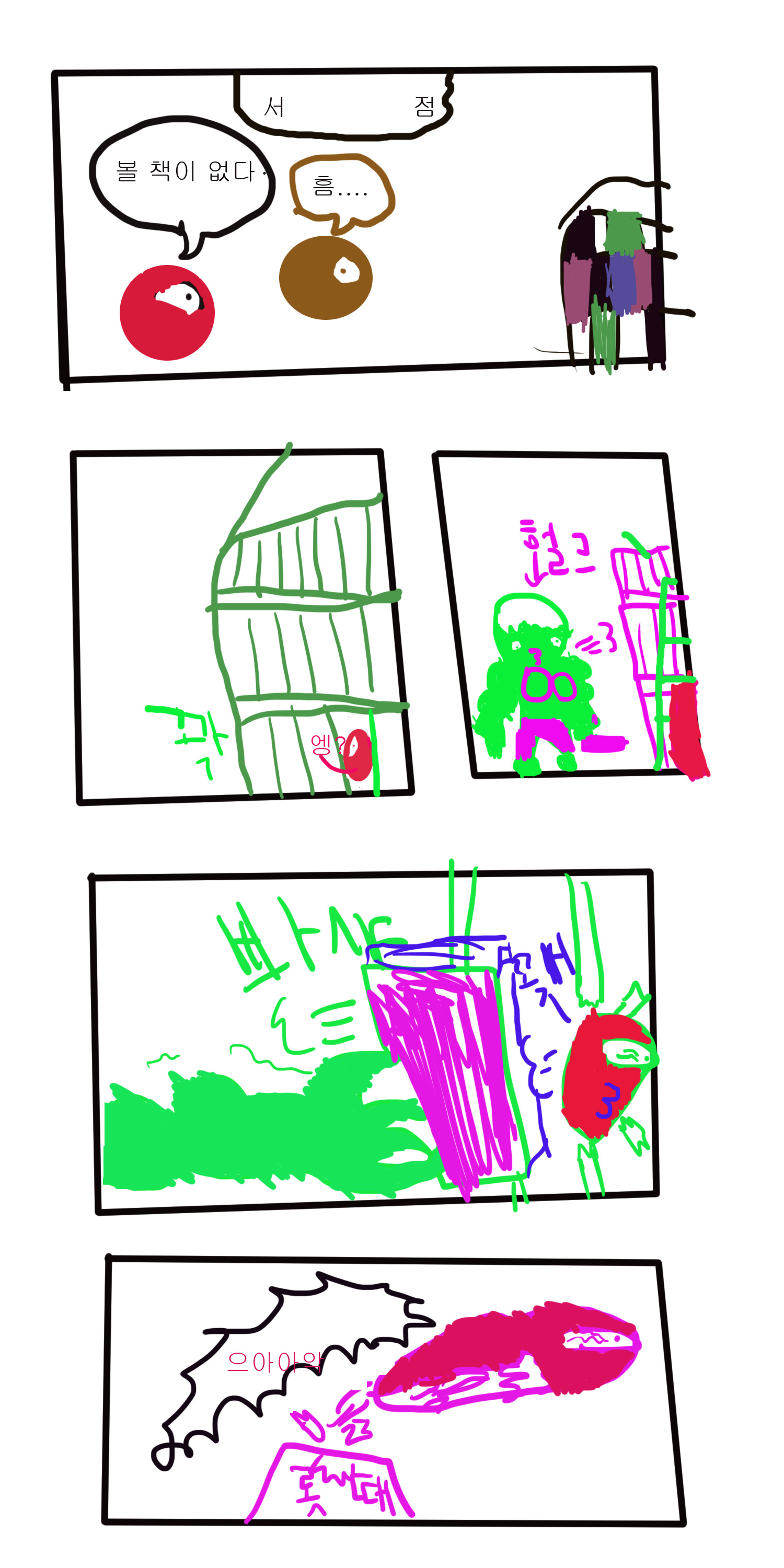 매운탕,갈비탕이 서점에 갔는데 사고가 일어남.